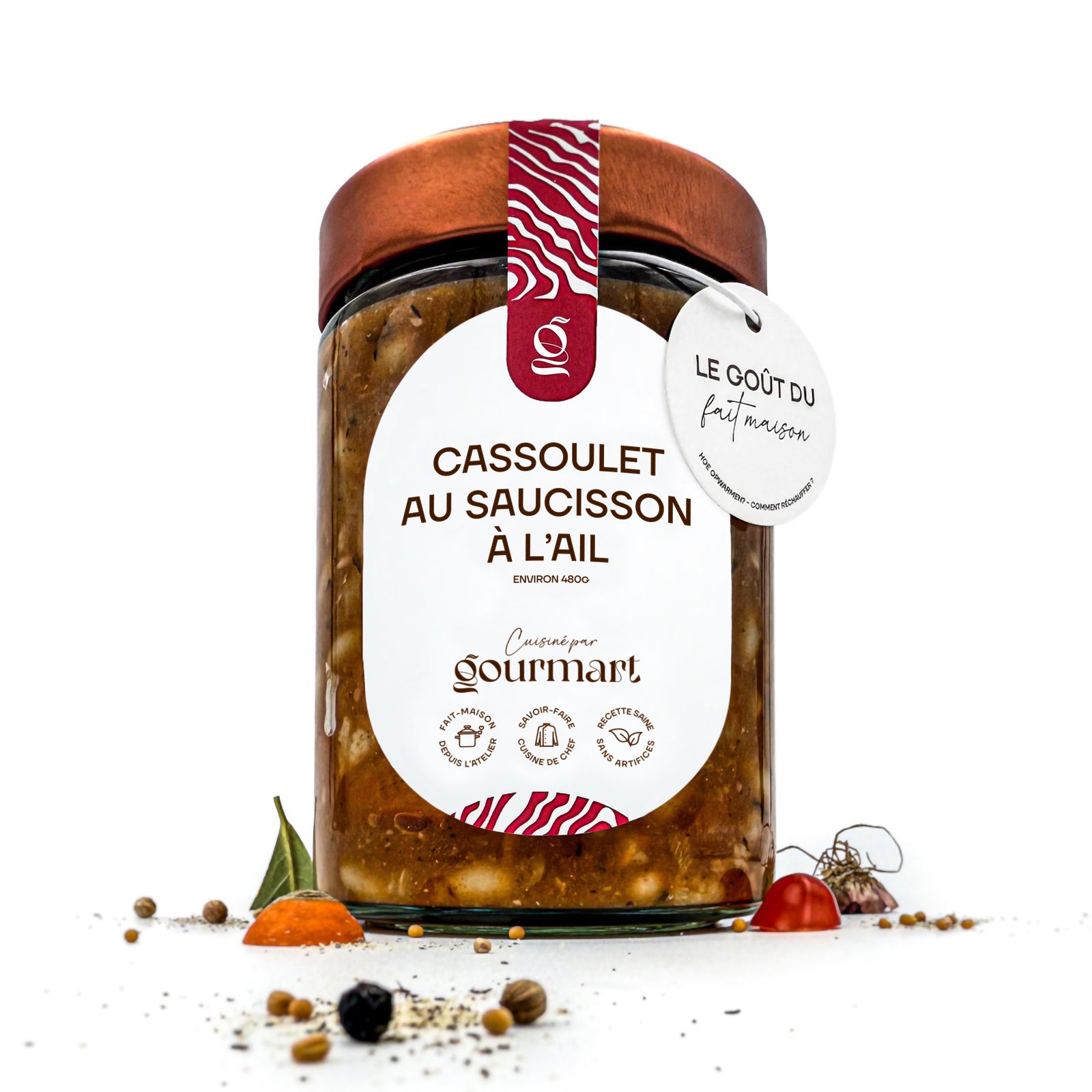 Plutôt que d’opter pour le confit de canard, dont la texture délicate et la séparation des graisses compliquent la pasteurisation, nous avons privilégié le saucisson à l’ail. Sa stabilité thermique, sa texture moelleuse préservée après traitement et son assaisonnement subtilement épicé en font un choix optimal. Sa matière grasse homogène, bien intégrée à la préparation, garantit une liaison naturelle et prévient tout risque de dessèchement. Il apporte ainsi une intensité gustative qui s’équilibre parfaitement avec la douceur des haricots et la richesse du bouillon, assurant une cohérence des saveurs et une tenue idéale à la dégustation.